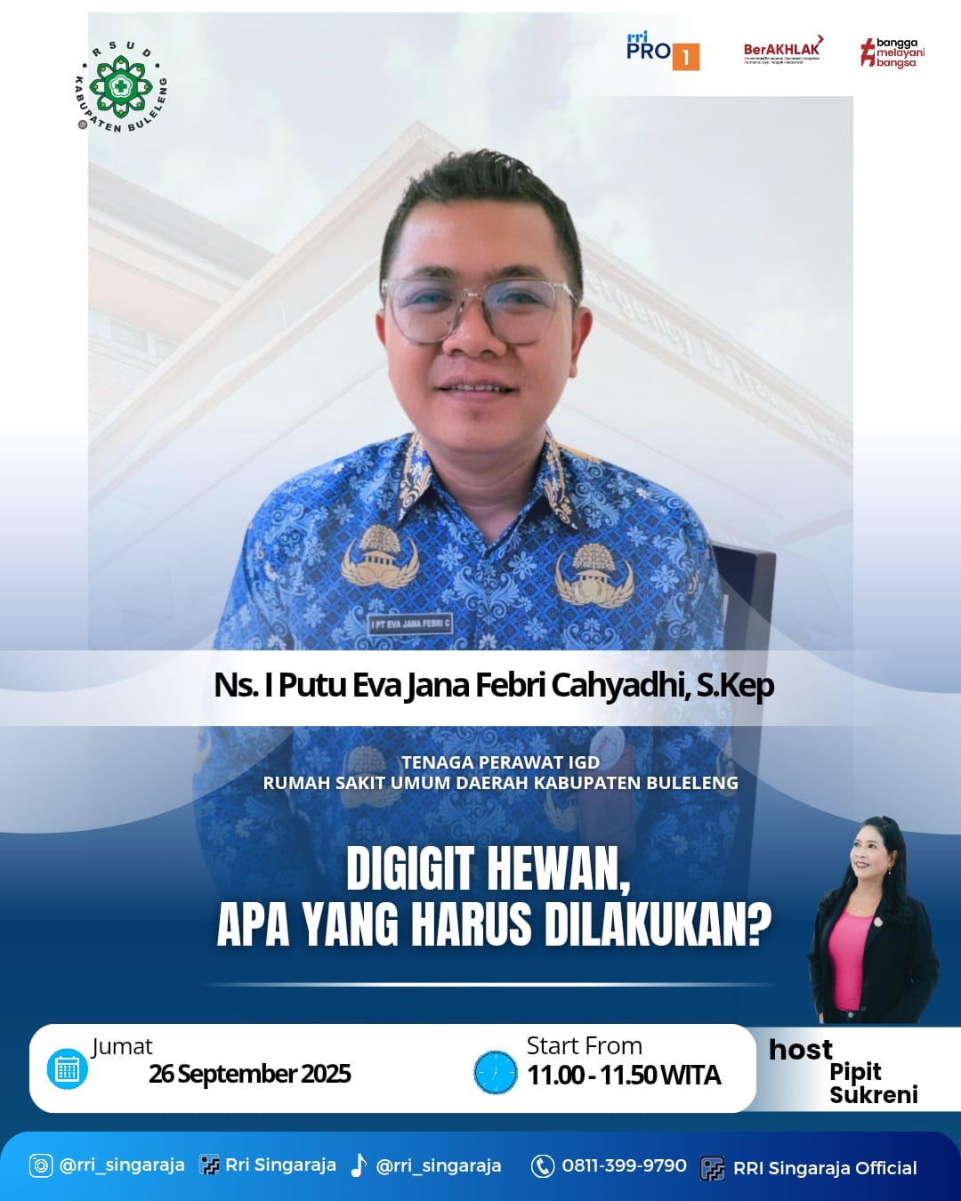 Tema ''Digigit Hewan, Apa Yang Harus Dilakukan?'' pada dialog interaktif yang disiarkan secara langsung oleh RRI Singaraja akan memberikan pemahaman dan edukasi kepada masyarakat. Kegiatan dialog interaktif terlaksana pada Jumat, 26 September 2025 diisi oleh Ns. I Putu Jana Pebri Cahyadhi, S.Kep