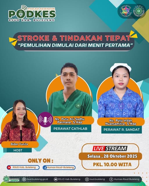 Jangan lewatkan Podcast Kesehatan Live pada Selasa 28 Oktober 2025 Pukul 10.00 Wita hanya di Instagram dan Facebook RSUD Kabupaten Buleleng.