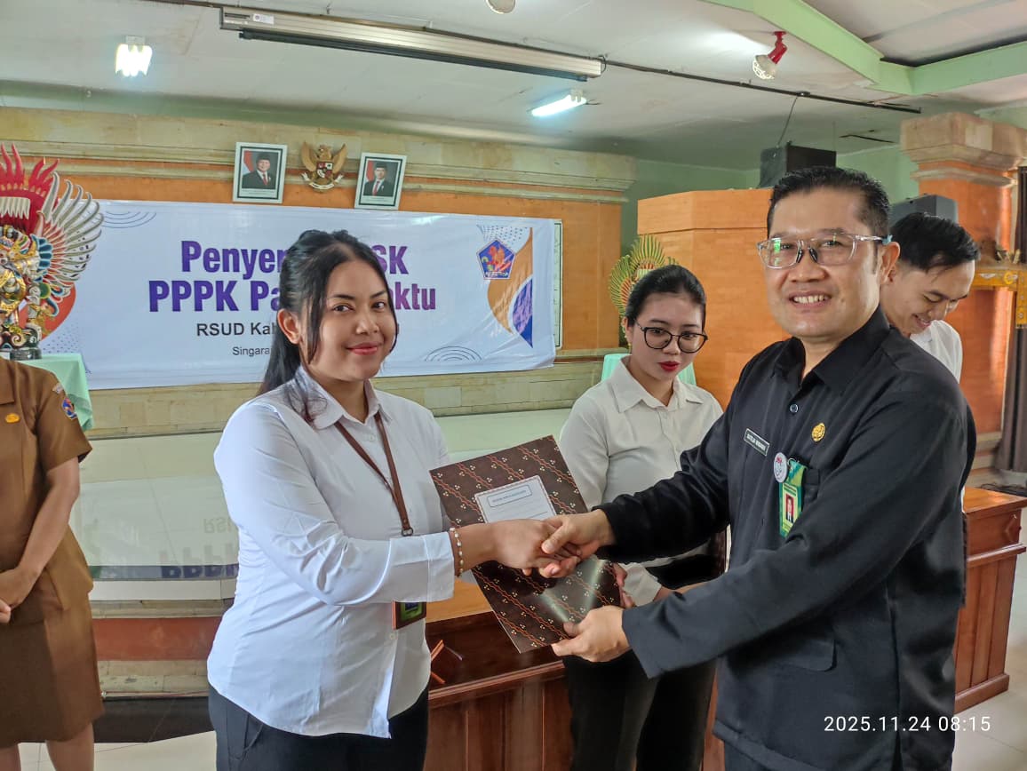 Singaraja (24/11) Nuansa gembira sangat terasa di ruang Aula Wijaya Kusuma RSUD Kabupaten Buleleng pada Senin, 24 Nopember 2025. Sebanyak 173 orang pegawai kontrak yang dinyatakan lulus sebagai Pegawai Pemerintah dengan Perjanjian Kerja (PPPK) Paruh Waktu menerima SK Pengangkatan. Penyerahan SK diberikan langsung oleh Direktur RSUD Kabupaten Buleleng, dr. Ketut Suteja Wibawa, Sp.KK, M.Kes didampingi oleh jajaran direksi dan kepala bagian RSUD Kab. Buleleng